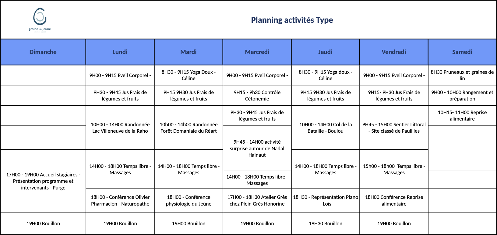 Toutes les activités sont incluses dans le séjour. Les jours et les horaires sont cependant variables.